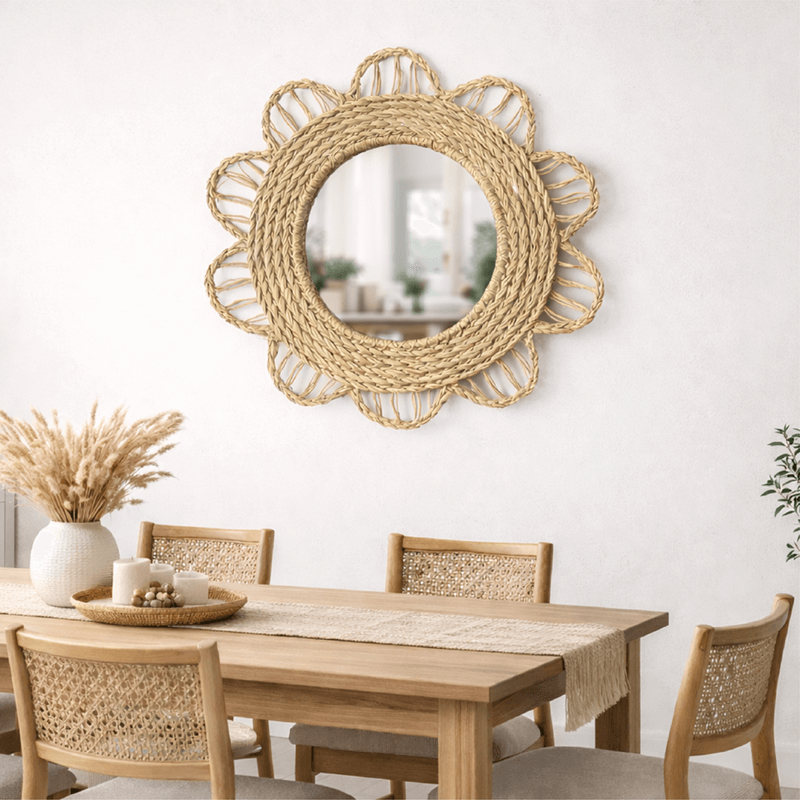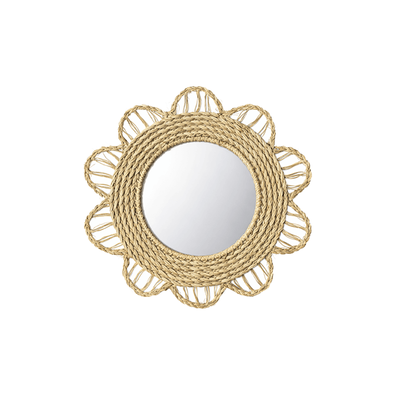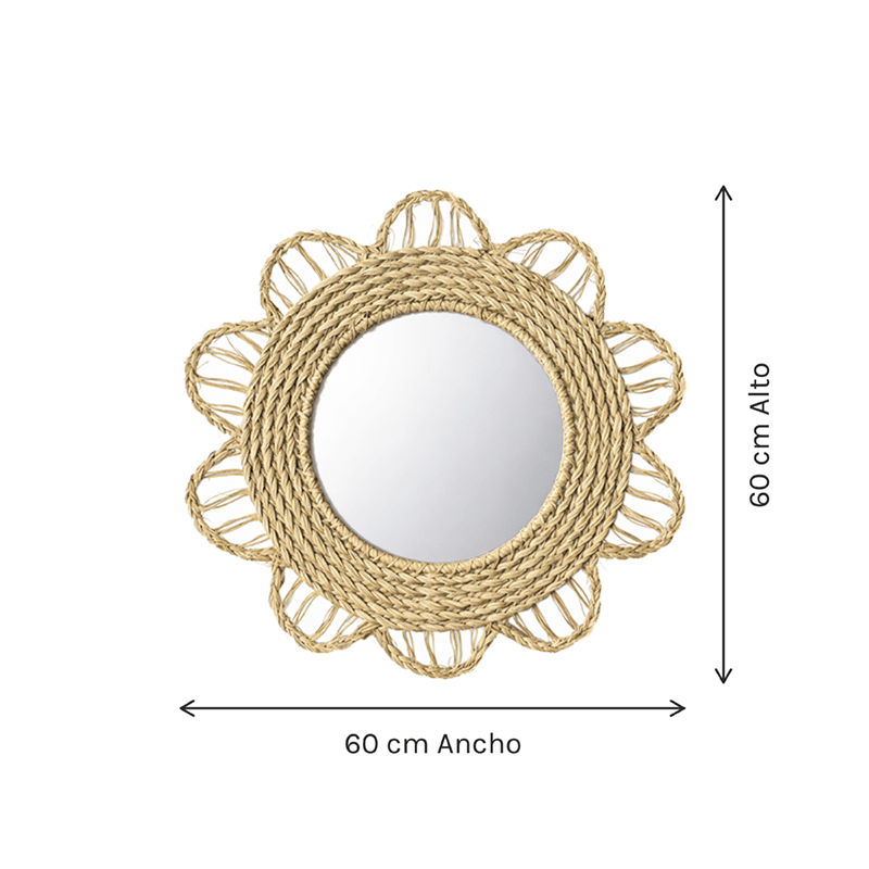 Su diseño combina la belleza orgánica de la fibra natural con un espejo central pulido que refleja la luz y mejora la sensación de amplitud en cualquier estancia. Gracias a su forma de flor y a su acabado natural, se integra fácilmente en ambientes mediterráneos, rústicos, minimalistas o bohemios.
