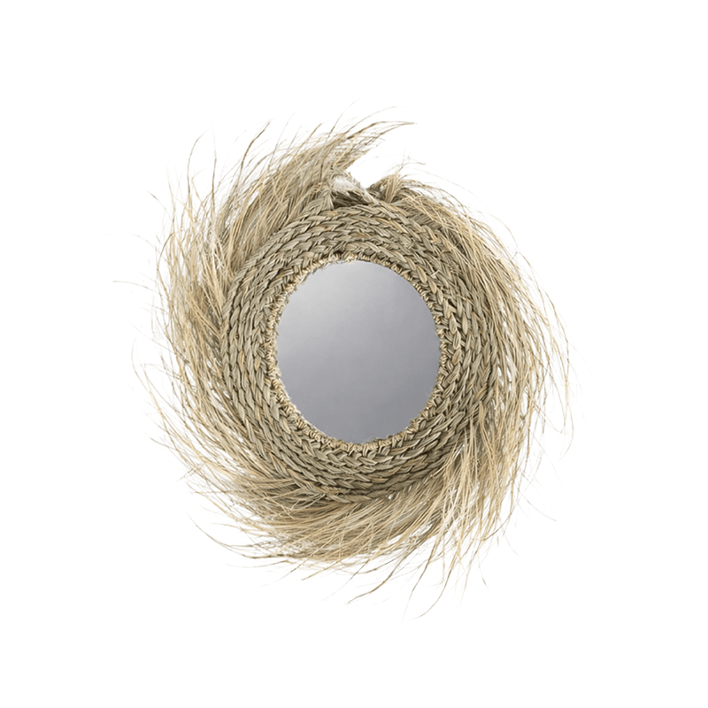 Su diseño combina la belleza orgánica de la fibra natural con un espejo central pulido que refleja la luz y mejora la sensación de amplitud en cualquier estancia. Gracias a su forma redonda y a su acabado natural, se integra fácilmente en ambientes mediterráneos, rústicos, minimalistas o bohemios.