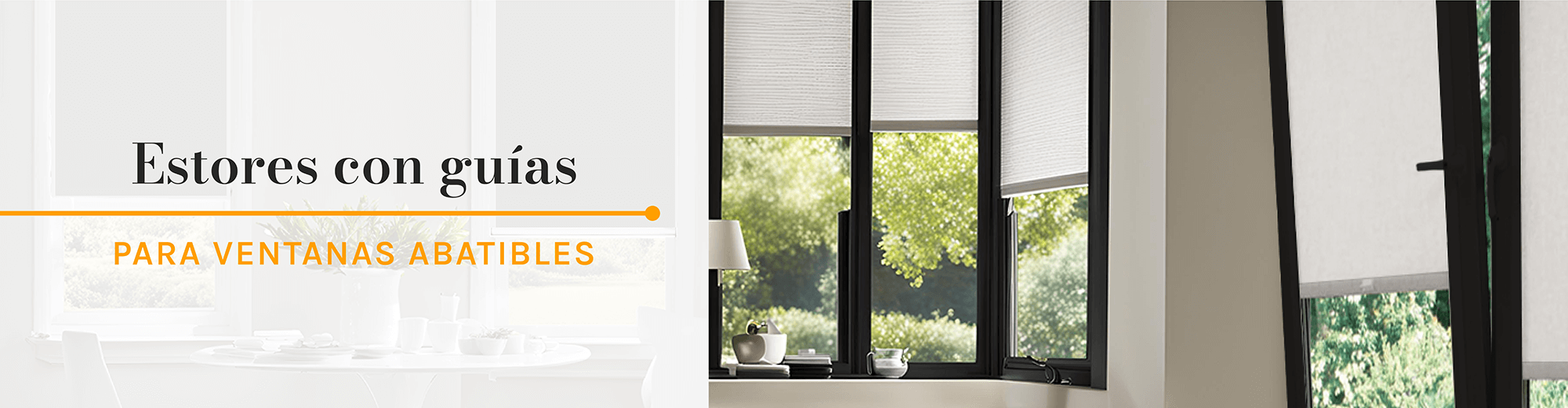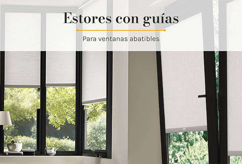 El tejido de un estor ventana abatible se desplaza en vertical mediante un sistema de guías laterales y contrapeso, por lo que es posible detenerlo a cualquier altura regulando así la cantidad de luz que penetra en la estancia. Además, estas guías se ajustan al hueco de la ventana e impiden el paso de los rayos solares por los laterales del textil.