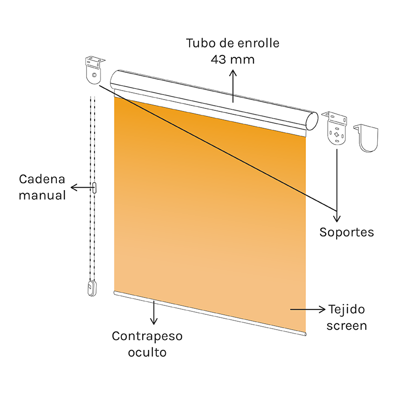El estor blanco de 2 x 2.5 m está confeccionado con un tejido screen compuesto por 70% PVC y 30% Poliéster. Cuenta con un tubo de enrolle es de 43 mm, sentido de enrollamiento a pared (por defecto) y accionamiento manual con cadena. La instalación de este modelo de estor enrollable es muy sencilla y puede ser tanto al techo como a la pared.
