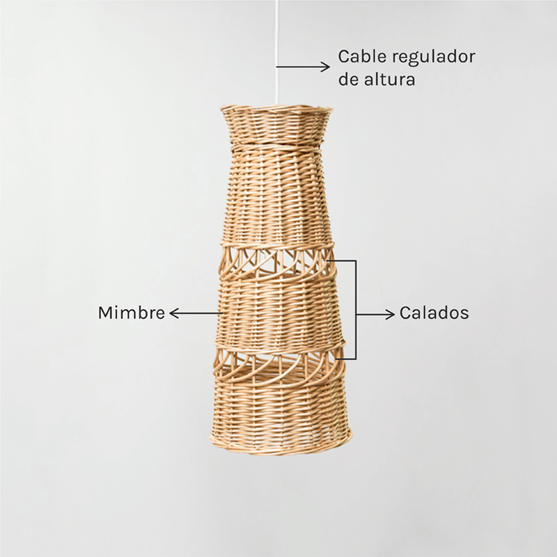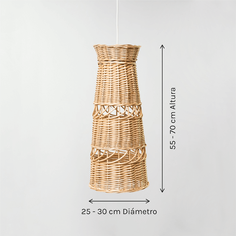 Las lámparas son una pieza fundamental en la decoración de interiores. Por este motivo, ofrecemos dos medidas de este diseño de lámpara de mimbre con forma capuchón calada con ribete.