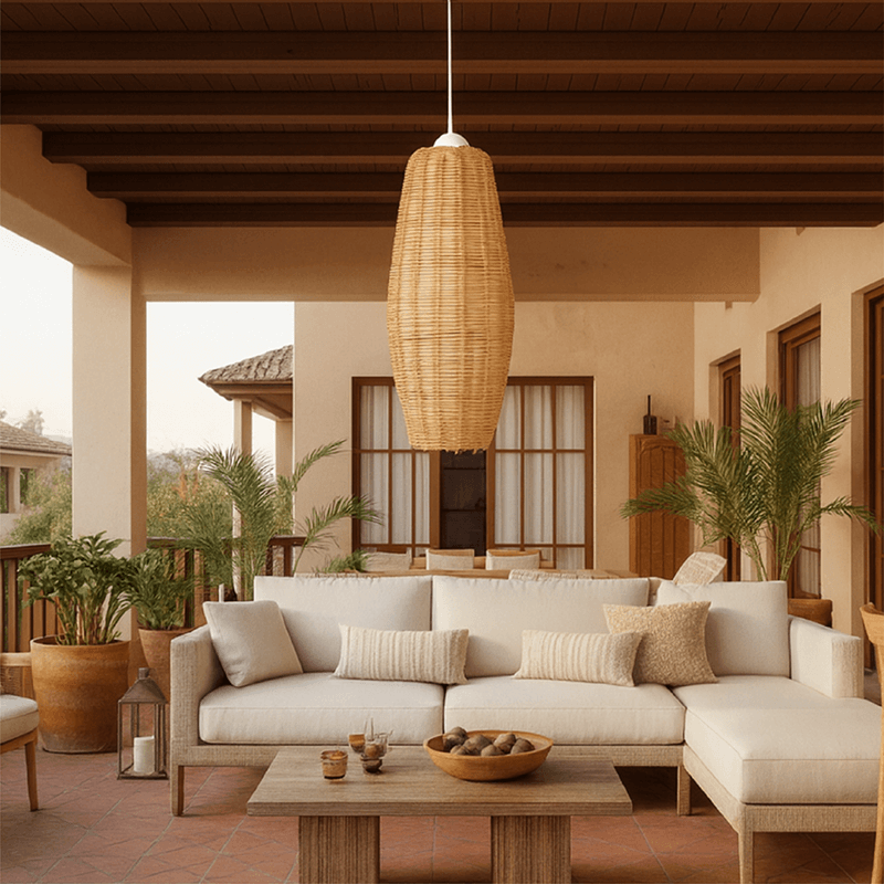 La versatilidad de los productos urdidos con mimbre admite la colocación de este tipo de lámparas en ambientes interiores o exteriores con estilos dispares. En este caso, su forma alargada se recomienda para espacios amplios o con techos altos.
