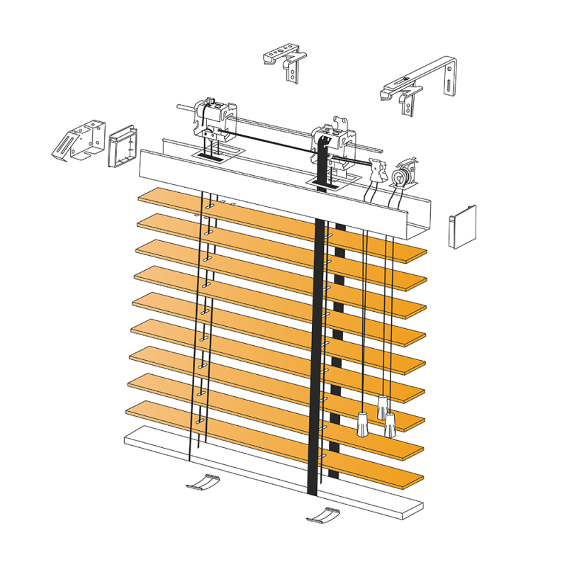 La veneciana Clásica 50 está hecha con lamas horizontales de aluminio, unidas entre sí con una cuerda de escalera (o escalerilla) y fijadas a la pared o al techo mediante un cabezal, contando con un riel, además de todas las fijaciones y accesorios para su instalación.