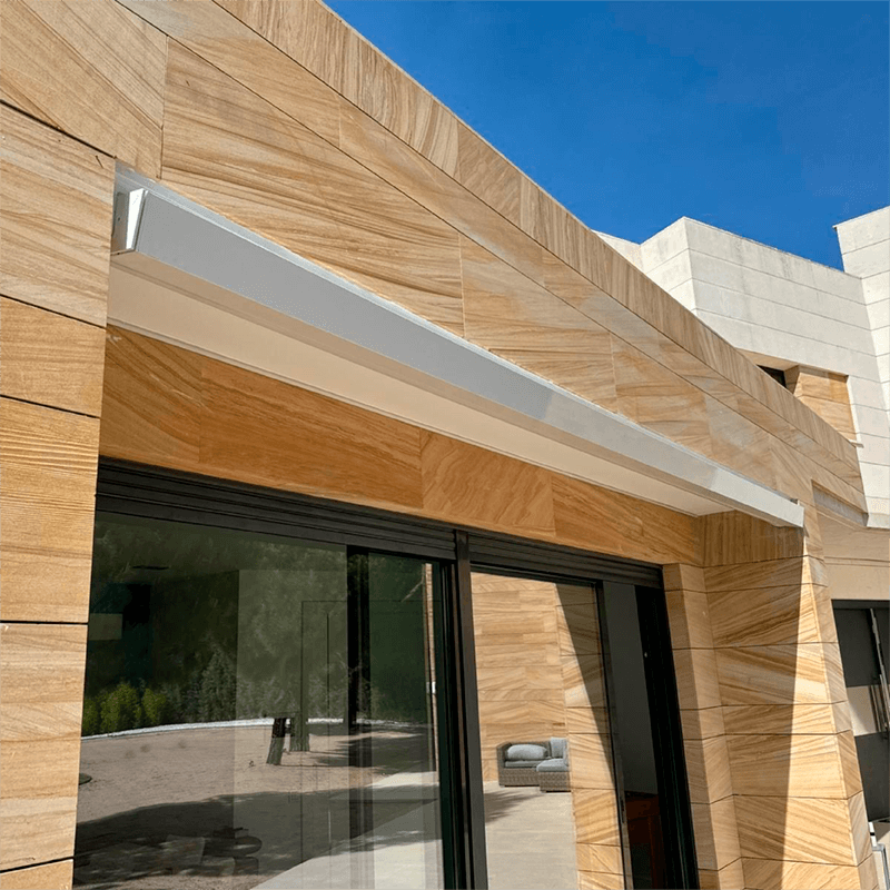 Toldo de brazos extensibles con cofre que mantiene una estética moderna y minimalista y ofrece uno de los sistemas más seguros del mercado. El cofre proporciona un extra de protección que alarga la vida útil del toldo, llegando a durar el doble de años que uno sin cofre. Es ideal para instalar en exteriores como terrazas, jardines, porches o patios. Las medidas máximas son 5 metros de ancho (línea) y 3 metros de largo (salida). Este toldo se fabrica a medida en aluminio lacado de alta calidad con personalización en el tipo de lona, el color, las medidas, el herraje y el accionamiento manual o motorizado. Es fácil de instalar y cuenta con inclinación regulable que se adapta a pared o techo.