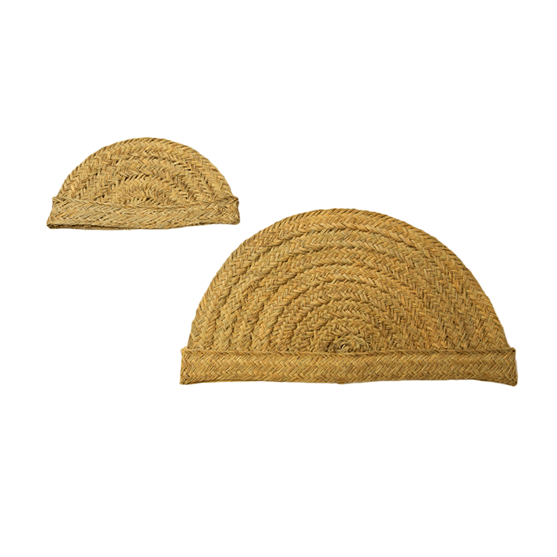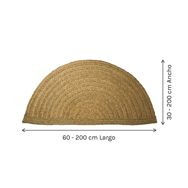 O tapete de esparto de relva feito à mão em forma de meia-lua é um modelo de alta qualidade, que combina elegância e funcionalidade. É composto por uma prega semelhante à premium na cor dourada e uma bainha em toda a sua extensão para reforçar a trama e aumentar a vida útil do produto.