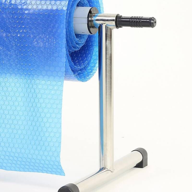 O enrolador para cobertores de bolhas até 5,50 m é acionado manualmente por meio de um volante. O tubo de enrolamento (alumínio) tem 81 mm de diâmetro e quatro pés (aço inoxidável). As pernas de uma extremidade são fixas e as pernas da outra extremidade têm rodas para facilitar a deslocação do enrolador. Inclui 8 correias de fixação.