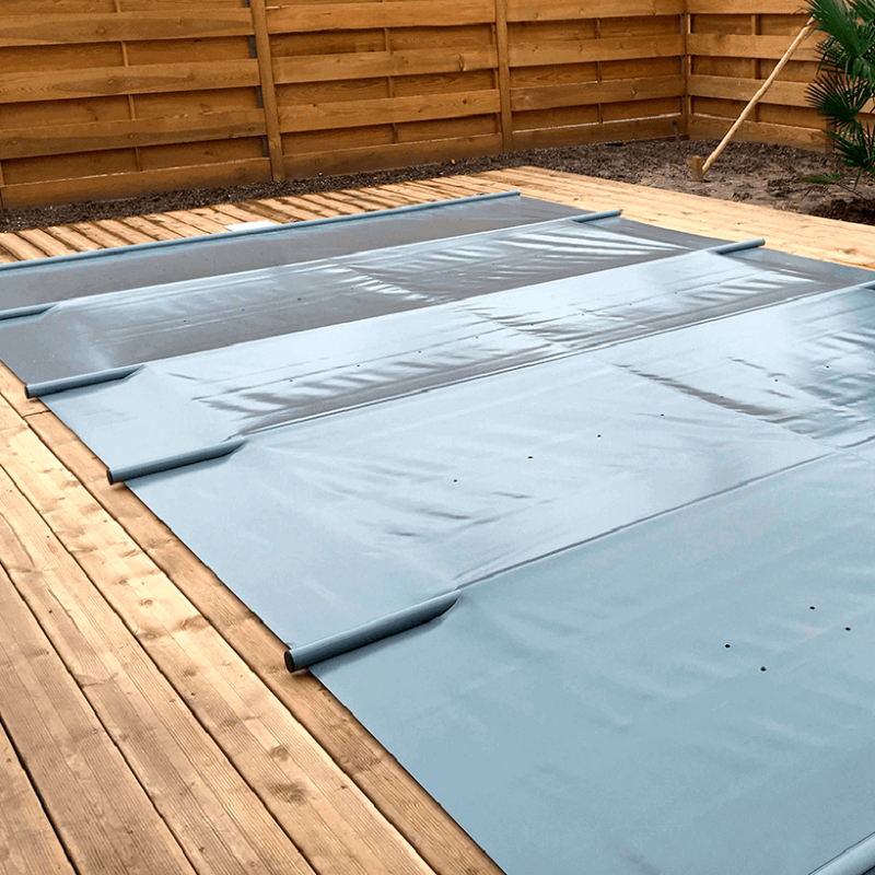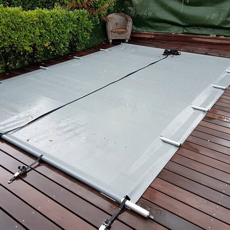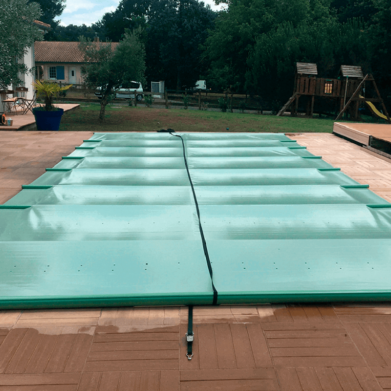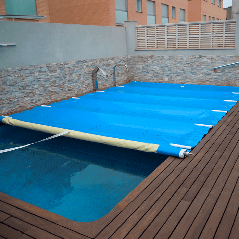 Barras de cobertura de segurança para piscinas; A lona tem espessura de 620 g/m2, possui um material econômico e resistente, é fabricada sob medida, de acordo com as medidas e características da sua piscina. Possui 3 funções: cobertura térmica, cobertura de inverno e cobertura de segurança. Seu principal benefício é permitir caminhar sobre a lona, evita quedas acidentais, suportando peso de até 80kg, por isso é especialmente recomendado para crianças e animais de estimação sem supervisão.