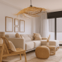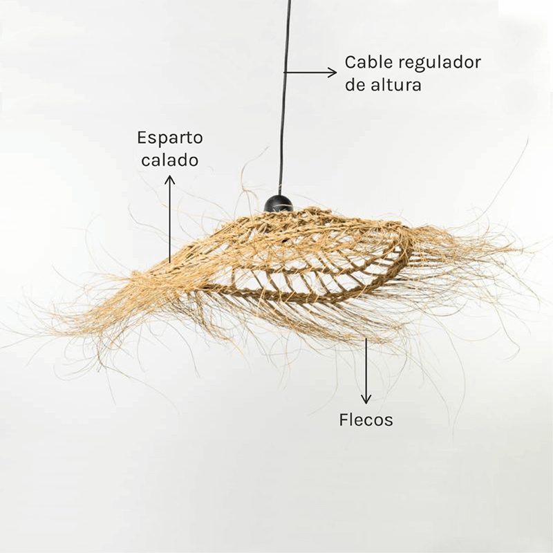 Com um ecrã poroso de estilo rústico, o candeeiro de esparto plano com franjas é o elemento ideal para proporcionar uma excelente iluminação em divisões escuras, uma vez que os seus amplos orifícios permitem a passagem da luz em todas as direções. Além disso, a composição do entrançado e as franjas do candeeiro impedem a trajetória da luz, pelo que a luminosidade se reflete de forma desigual nas diferentes paredes da divisão, conferindo grande personalidade ao ambiente.