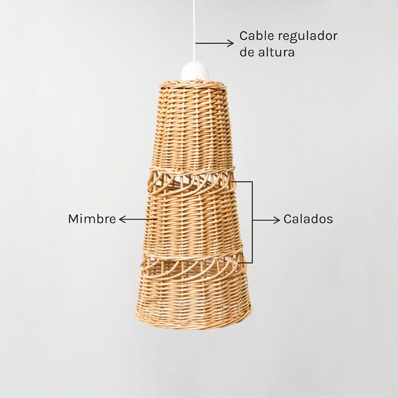 A longa vida útil desta prática lâmpada de vime com forma de capuz com buracos é garantida devido às propriedades inatas do vime, pois é um material tão rígido quanto leve, e à fácil manutenção que requer.