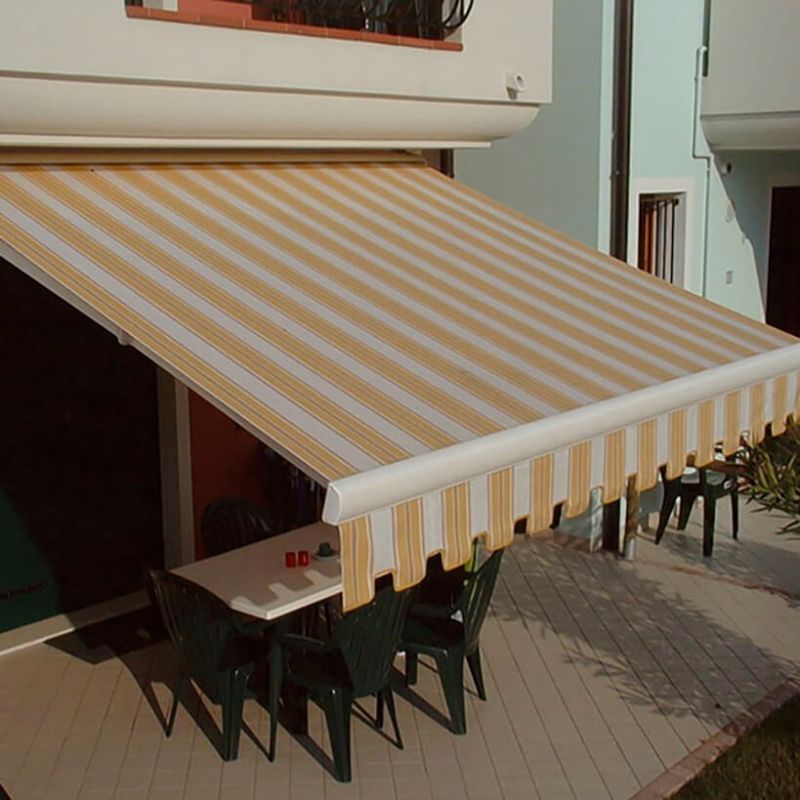 O tecido tem um nível de proteção solar de 60 para as cores claras e de 80 para as cores escuras. O material que utilizamos para o tecido do toldo de braço extensível foi concebido para evitar que os raios UV penetrem na pele das pessoas que se abrigam debaixo do toldo. Além disso, consoante o tipo de tecido escolhido, também protege da chuva.