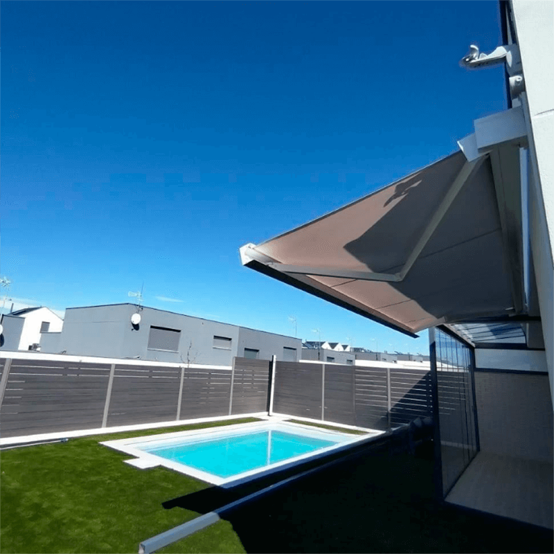 Toldo de braço extensível com cassete que mantém uma estética moderna e minimalista e oferece um dos sistemas mais seguros do mercado. A cassete proporciona uma proteção extra que prolonga a vida do toldo, durando o dobro do tempo de um toldo sem cassete. É ideal para instalação no exterior em terraços, jardins, alpendres ou pátios. As dimensões máximas são de 5 metros de largura (linha) e 3 metros de comprimento (saída). Este toldo é fabricado à medida em alumínio lacado de alta qualidade com personalização no tipo de tecido, cor, medidas, ferragens e acionamento manual ou motorizado. É fácil de instalar e tem uma inclinação ajustável que se adapta à parede ou ao teto.