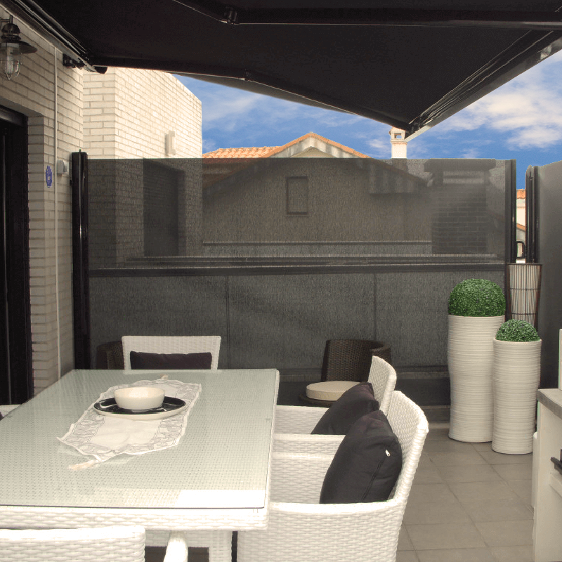 Toldo lateral enrolável feito à medida, especialmente concebido para terraços. Proporciona uma maior privacidade e funciona como divisória de espaços.