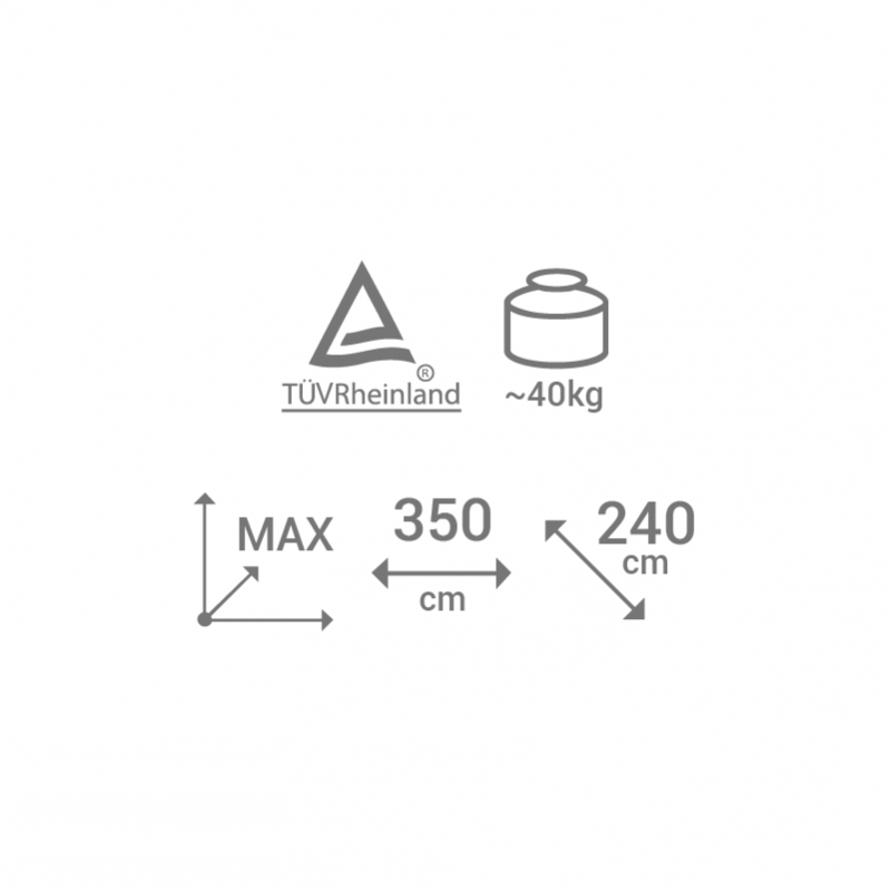 As suas dimensões máximas são 2,40 m de comprimento e 3,50 m de altura. A sua estrutura é constituída por dois postes que devem ser aparafusados um ao chão e outro à parede; Uma delas é a caixa onde vai a lona e a outra é onde a lona é engatada. É fabricado em alumínio da mais alta qualidade.