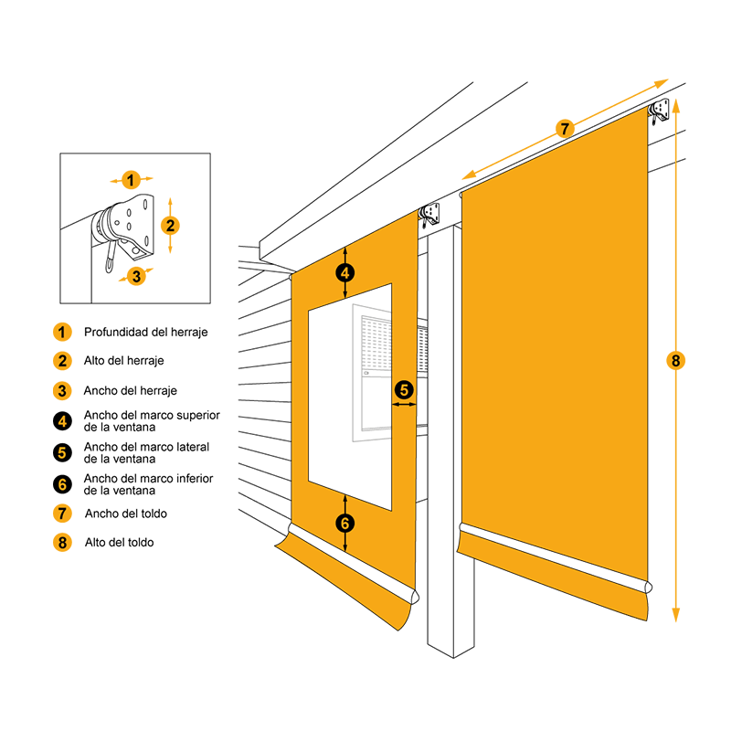 Os toldos verticais são especialmente adequados para a vedação de espaços. Deve medir a largura total do espaço a cobrir, quer se trate de um modelo com ou sem cassete, uma vez que a largura se refere a todo o conjunto (estrutura e lona); a altura total a cobrir e se os acessórios cabem. Para mais pormenores, pode ler o nosso artigo aquí. Para as dimensões do hardware, consultar a ficha técnica do produto.