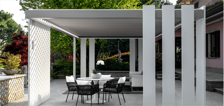 Um sistema inovador de lamas de alumínio que se adapta a diferentes soluções de pérgulas, substituindo os montantes. Cada projeto será único e exclusivo.