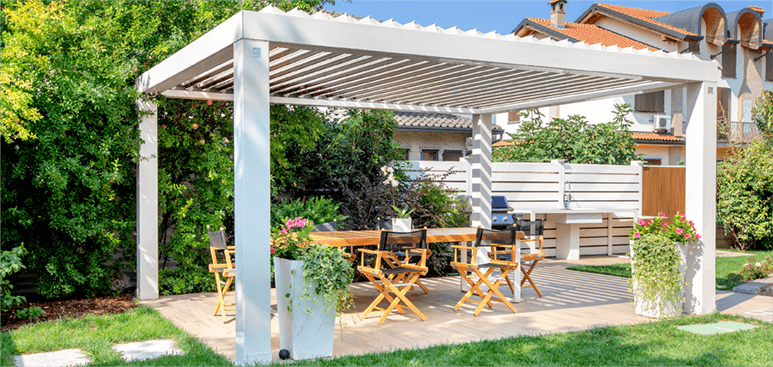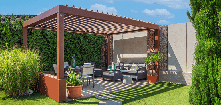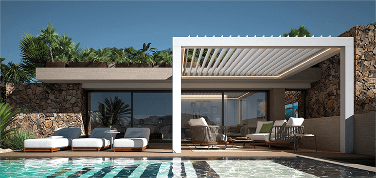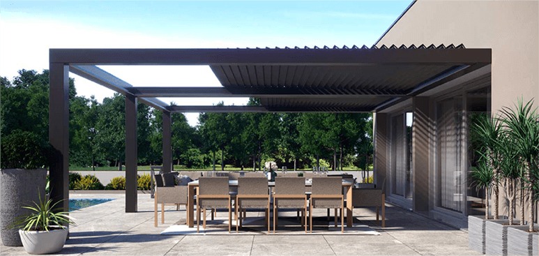 Pérgola bioclimática retrátil e autoportante com lamas de alumínio ajustáveis de 0 a 69 graus, que oferece proteção solar e funciona também como abrigo contra a chuva.
