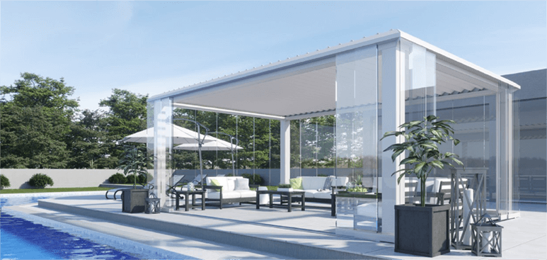 Pérgola bioclimática autoportante em alumínio com um inovador sistema de vidro deslizante nas laterais para obter um efeito “House of Glass”.